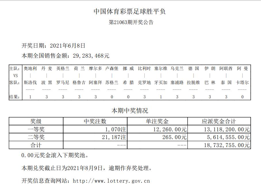 首页/ 赛事正文北京时间6月8日上午第21063期胜负彩开奖,一等奖1070注,单注奖金12260.00元,二奖金21187注,单注奖金265.00元。