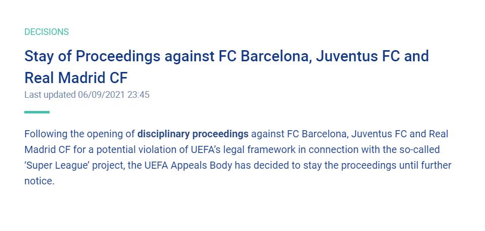 继欧足联决定对巴塞罗那、尤文图斯和皇家马德里因涉嫌违反欧足联纪律条款,违规成立所谓的“超级联赛”启动纪律处分程序后,目前欧足联上诉机构决定暂停诉讼,其他事项将另行通知。
