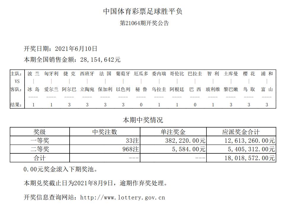 首页/ 赛事正文北京时间6月10日,胜负彩第21064期开奖结果揭晓。14场头奖33注38.2万元,2等奖开出968注5584元,任九头奖开出4331注1828元。本期足彩14场投注总额为28,154,642元,任九投注总额为12,373,732元。
