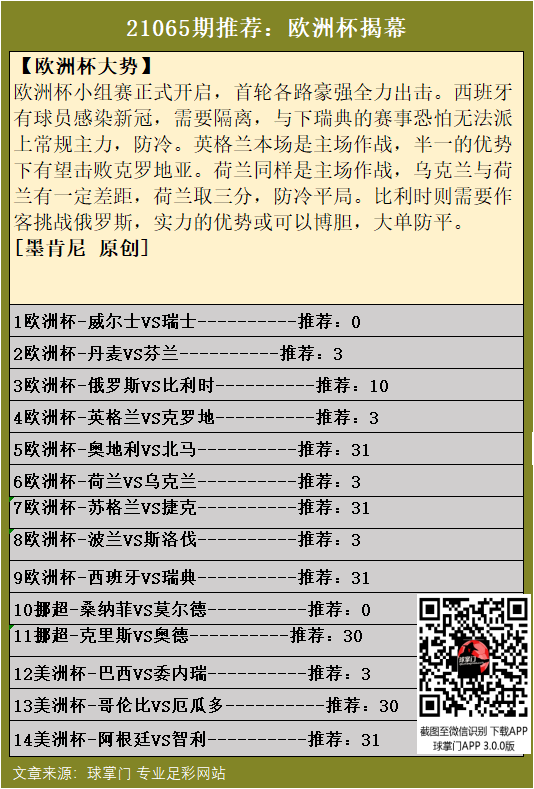 欧洲杯小组赛正式开启,首轮各路豪强全力出击。西班牙有球员感染新冠,需要隔离,与下瑞典的赛事恐怕无法派上常规主力,防冷。英格兰本场是主场作战,半一的优势下有望击败克罗地亚。荷兰同样是主场作战,乌克兰与荷兰有一定差距,荷兰取三分,防冷平局。比利时则需要作客挑战俄罗斯,实力的优势或可以博胆,大单防平。
