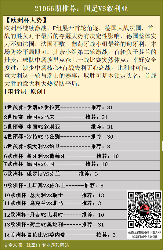 首页/ 赛事正文胜负彩2021066期欧洲杯+世预赛为主,本期6月15日(周二)20点30分截止,敬请留意。
