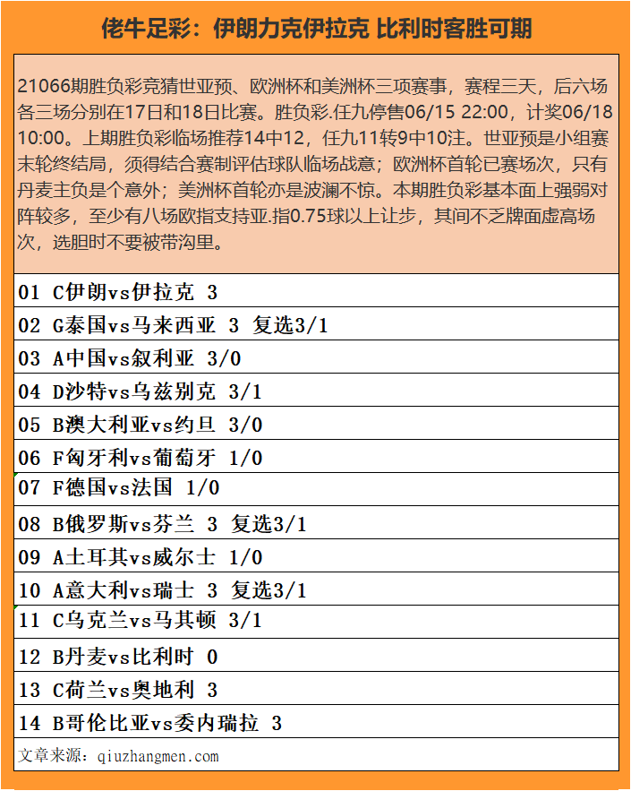 21066期竞猜世亚预、欧洲杯和美洲杯三项赛事,赛程三天,后六场各三场分别在17日和18日比赛。胜负彩.任九停售06/15 22:00,计奖06/18 10:00。上期胜负彩临场推荐14中12,任九11转9中10注。世亚预是小组赛末轮终结局,须得结合赛制评估球队临场战意;欧洲杯首轮已赛场次,只有丹麦主负是个意外;美洲杯首轮亦是波澜不惊。本期胜负彩基本面上强弱对阵较多,至少有八场欧指支持亚.指0.75球以上让步,其间不乏牌面虚高场次,选胆时不要被带沟里。