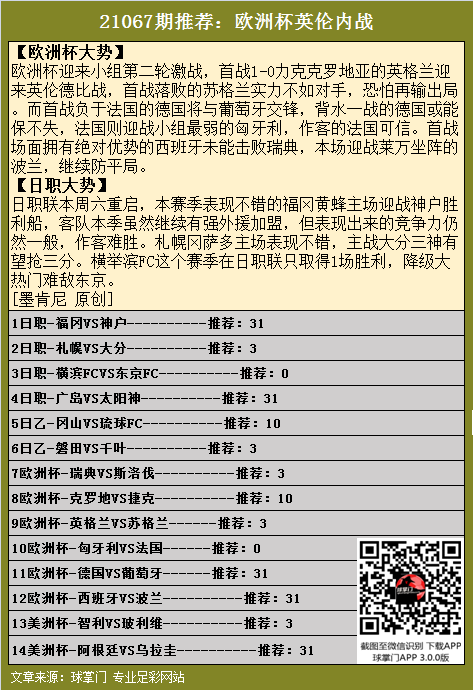 胜负彩2021067期日职+欧洲杯为主,本期6月18日(周五)20点30分截止,敬请留意