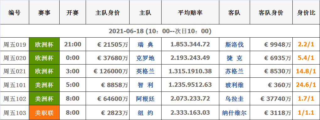 6月18日|球队对阵数据信息身价表