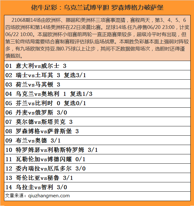21068期14场由欧洲杯、挪超和美洲杯三项赛事混猜,赛程两天,第3、4、5、6四场欧洲杯和第14场美洲杯在22日凌晨比赛。足球14场.任九停售06/20 23:00,计奖06/22 10:00。本届欧洲杯小组赛前两轮一直正路赛果较多,超级冷平时有出现,但第三轮终结局需要结合赛制赛程评估球队临场战意。本期胜负彩基本面上强弱对阵较多,有九场欧指支持亚.指0.75球以上让步,其间不乏数据做局场次,选胆时还得谨慎甄别。