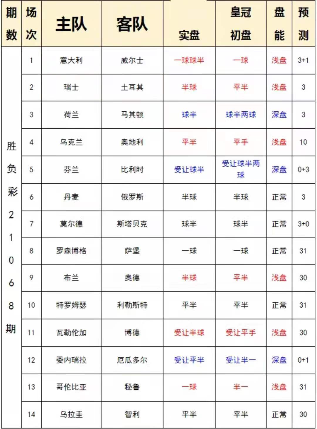 2、瑞士前2轮只获得1分,这场比赛只要取胜就可以获得4分,想获得小组第二比较难,想获得最好的小组第三还是比较容易,前提是多刷一个净胜球,这场比赛扎卡利亚出场的可能性很大;土耳其前2轮全败,打的毫无生机,球队即便赢的本场比赛,基本上也是很难获得晋级资格,毕竟净胜球太少了,居内什本场比赛可能会轮换多名球员练兵,战意有点模糊,本场初指是个浅盘,平半盘,后市则是连续甚至半一盘,一个低开高走的盘型,这个盘面变化也是发生在土耳其上轮不敌威尔士之后,应该是机构的防范姿态,这场比赛瑞士肯定热,后市这个走势还是没问题的,瑞士小胜的几率不小,赔率看30,不过个人倾向博主胜