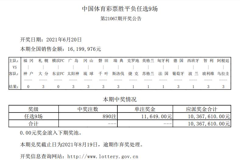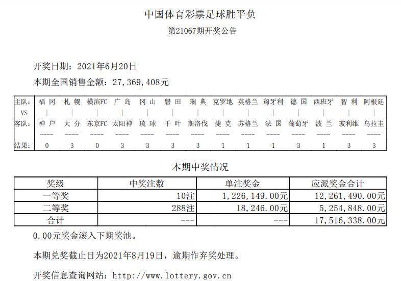首页/ 赛事正文北京时间6月20日,足球14场第21067期开奖结果揭晓。本期14场头奖开出10注122万多元,二等开出288注1.8万元,任九头奖开出890注1.1万元。本期14场销量为27,369,408元,任九投注总额为16,199,976元。