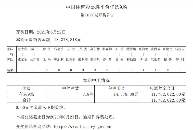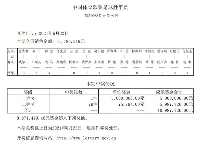 北京时间6月22日,胜负彩第21068期开奖结果已出。本期一等奖开1注500万,897万余元滚入下期奖池。二等开79注7.5万元,任九头奖开818注1.4万元。本期胜负彩销量为31,186,318元,任九投注总额为18,378,818元。