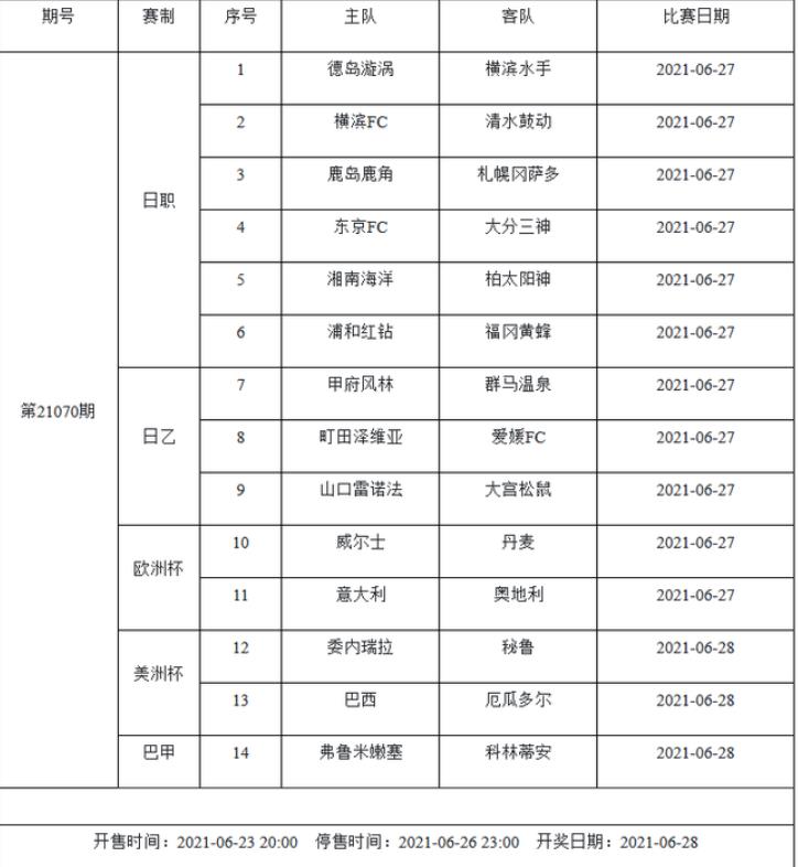 北京时间2021年6月22日,国家体彩中心公布了2021年6月25日-7月1日的足彩赛程。其中6月26日(周六)、6月29日(周二)有足彩停售。6月26日的足彩由日职、日乙、欧洲杯、美洲杯、巴甲组成;6月29日竞猜亚冠、欧洲杯、挪超、巴甲。以下为具体赛程通知:
