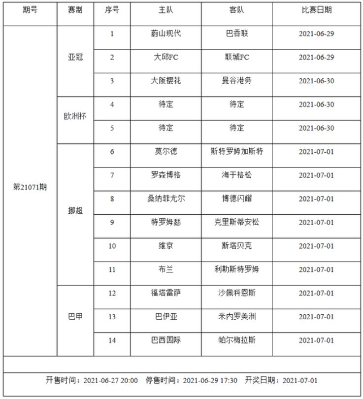 我中心制定了2021年中国足球彩票胜负游戏(14场、任选9场)、6场半全场胜负游戏和4场进球游戏6月25日-7月1日的竞猜场次安排(具体附后),其竞猜对象、开售时间、停售时间和计奖时间均以本文为准。