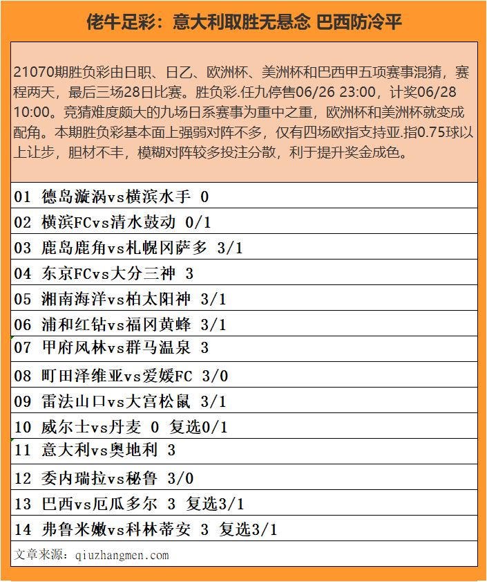 21070期胜负彩由日职、日乙、欧洲杯、美洲杯和巴西甲五项赛事混猜,赛程两天,最后三场28日比赛。胜负彩.任九停售06/26 23:00,计奖06/28 10:00。竞猜难度颇大的九场日系赛事为重中之重,欧洲杯和美洲杯就变成配角。本期胜负彩基本面上强弱对阵不多,仅有四场欧指支持亚.指0.75球以上让步,胆材不丰,模糊对阵较多投注分散,利于提升奖金成色。