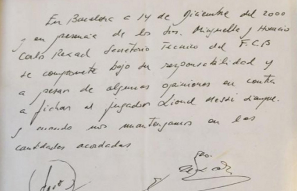 这张著名的纸巾合同上写道:“在巴塞罗那,2000年12月14日,在明格拉和霍拉西奥先生在场的情况下,技术秘书卡洛斯-雷克扎克承担了他的责任,尽管我们对梅西的签约存在一些分歧,但我们保持了约定的承诺。”