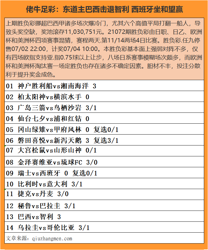上期胜负彩挪超巴西甲诸多场次爆冷门,尤其六个高值平局打翻一船人,导致头奖空缺,奖池滚存11,030,751元。21072期胜负彩由日职、日乙、欧洲杯和美洲杯四项赛事混猜,赛程两天.第11/14两场4日比赛。胜负彩.任九停售07/02 22:00,计奖07/04 10:00。本胜负彩基本面上强弱对阵不多,仅有四场欧指支持亚.指0.75球以上让步,八场日系赛事模糊场次颇多,而欧洲杯和美洲杯淘汰赛一场定胜负也存在诸多不确定因素。胆材不丰,投注分散利于提升奖金成色。