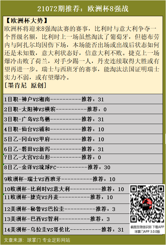欧洲杯将迎来8强淘汰赛的赛事,比利时与意大利争夺一个晋级名额,比利时上一场虽然淘汰了葡萄牙,但德布劳内与阿扎尔均因伤下场,本场能否出场或出战后状态如何还是未知数,意大利状态好,信意大利不败。捷克上一场爆冷击败了荷兰,对手少踢一人,丹麦连续取得大胜或有望再进一步。瑞士与西班牙的赛事,能淘汰法国证明瑞士实力不弱,或有望爆冷。