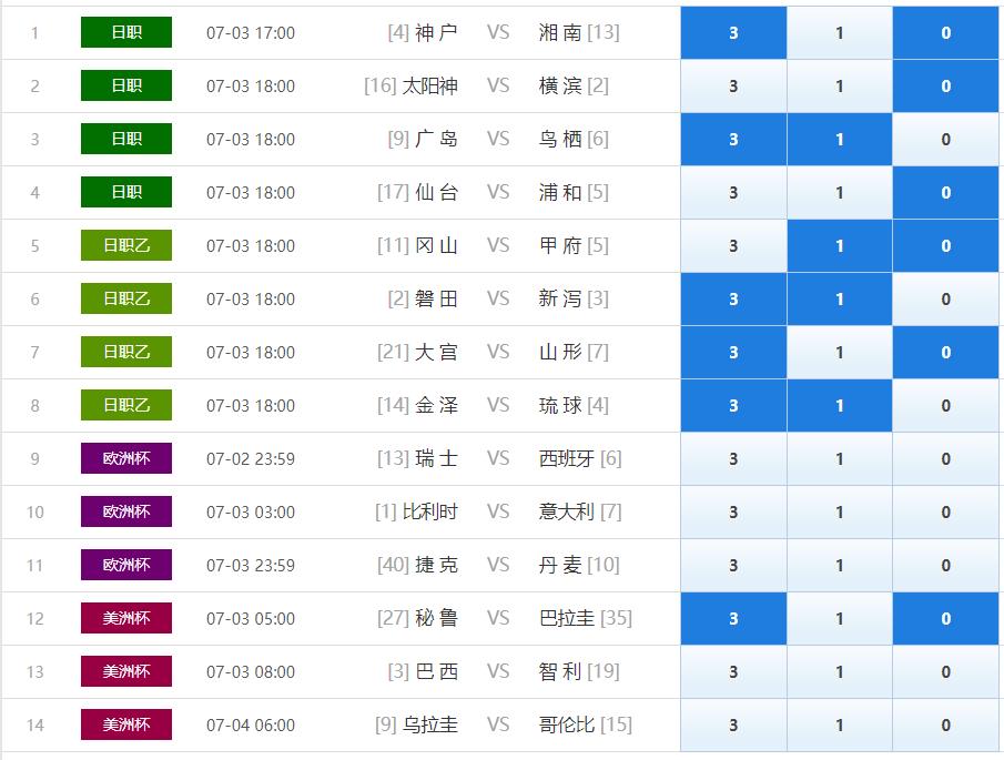 首页/ 赛事正文胜负彩第21072期的14场主要有抗日、欧洲杯和美洲杯的比赛构成;本期深度让步仅有巴西一场,多数场次让步略低,而且加上6场杯赛,很有可能会出冷门,增加本期14场难度,本期整体难度中等偏上。