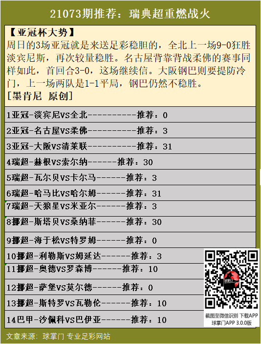 周日的3场亚冠就是来送足彩稳胆的,全北上一场9-0狂胜淡宾尼斯,再次较量稳胜。名古屋背靠背战柔佛的赛事同样如此,首回合3-0,这场继续信。大阪钢巴则要提防冷门,上一场两队是1-1平局,钢巴仍然不稳胜。