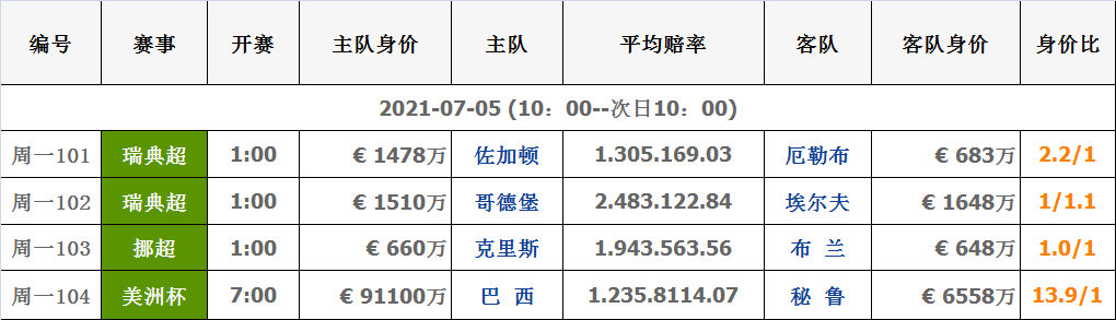 7月5日|球队对阵身价信息数据表