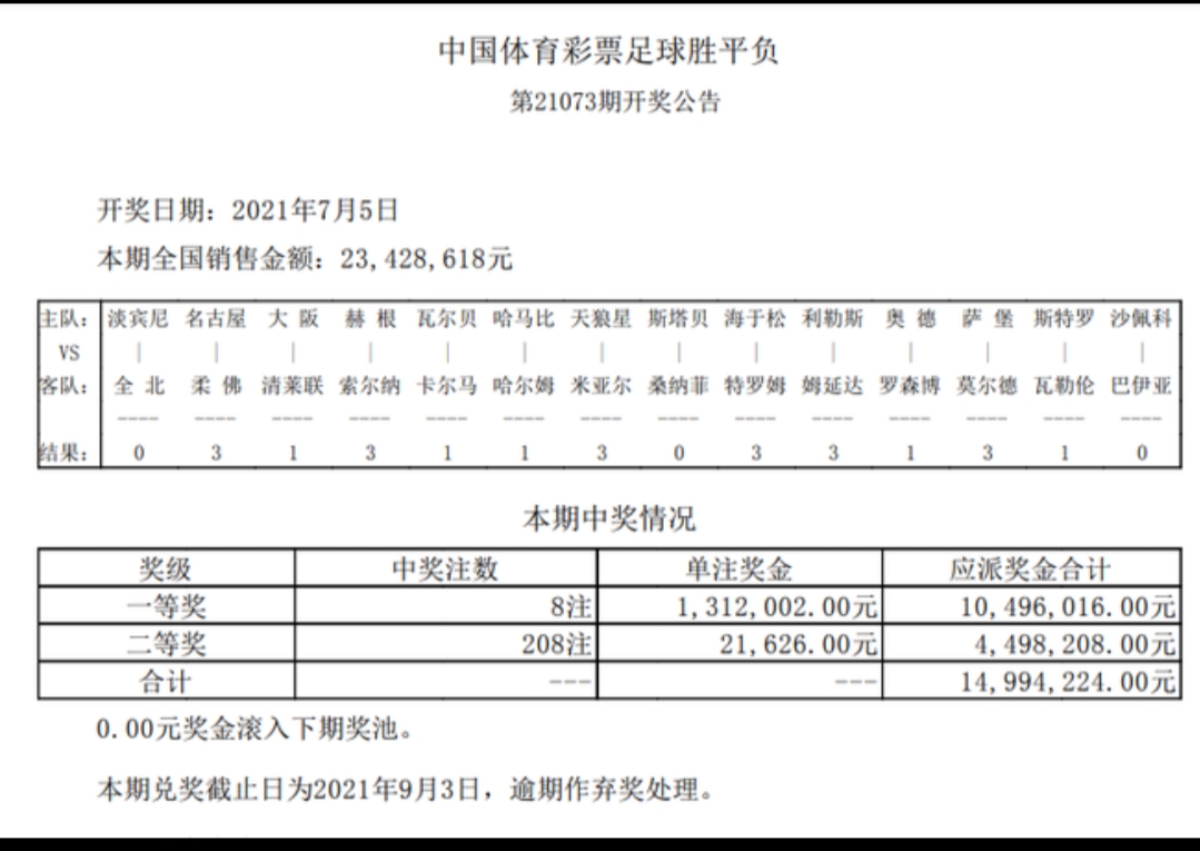 首页/ 赛事正文北京时间7月5日,胜负彩第21073期开奖结果揭晓。14场头奖8注131万元,二等208注21626元;任九头奖开出1351注6793元。本期胜负彩14场投注总额为23,428,618元,任九投注总额14,341,694元。