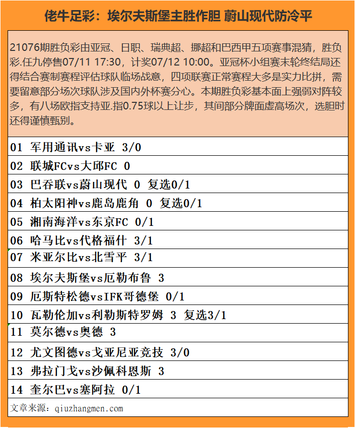 21076期胜负彩由亚冠、日职、瑞典超、挪超和巴西甲五项赛事混猜,胜负彩.任九停售07/11 17:30,计奖07/12 10:00。亚冠杯小组赛末轮终结局还得结合赛制赛程评估球队临场战意,四项联赛正常赛程大多是实力比拼,需要留意部分场次球队涉及国内外杯赛分心。本期胜负彩基本面上强弱对阵较多,有八场欧指支持亚.指0.75球以上让步,其间部分牌面虚高场次,选胆时还得谨慎甄别。