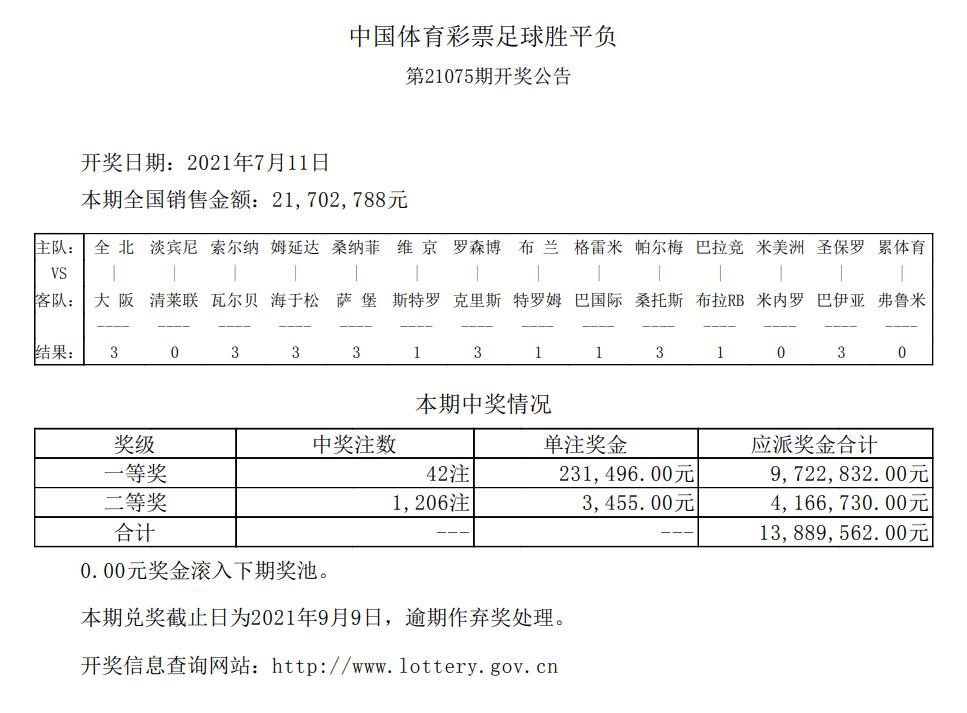 首页/ 赛事正文球掌门7月11日获悉,胜负彩第21075期开奖结果揭晓。本期14场头奖42注23万多元,二等1206注3455元;任九头奖开出9053注1075元。本期足彩14场投注总额为21,702,788元,任九投注总额为15,211,886元。