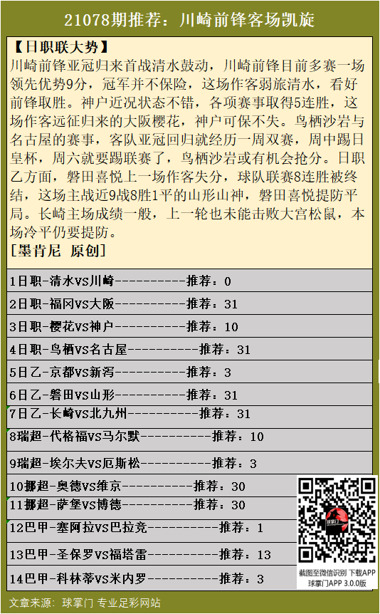 川崎前锋亚冠归来首战清水鼓动,川崎前锋目前多赛一场领先优势9分,冠军并不保险,这场作客弱旅清水,看好前锋取胜。神户近况状态不错,各项赛事取得5连胜,这场作客远征归来的大阪樱花,神户可保不失。鸟栖沙岩与名古屋的赛事,客队亚冠回归就经历一周双赛,周中踢日皇杯,周六就要踢联赛了,鸟栖沙岩或有机会抢分。日职乙方面,磐田喜悦上一场作客失分,球队联赛8连胜被终结,这场主战近9战8胜1平的山形山神,磐田喜悦提防平局。长崎主场成绩一般,上一轮也未能击败大宫松鼠,本场冷平仍要提防。