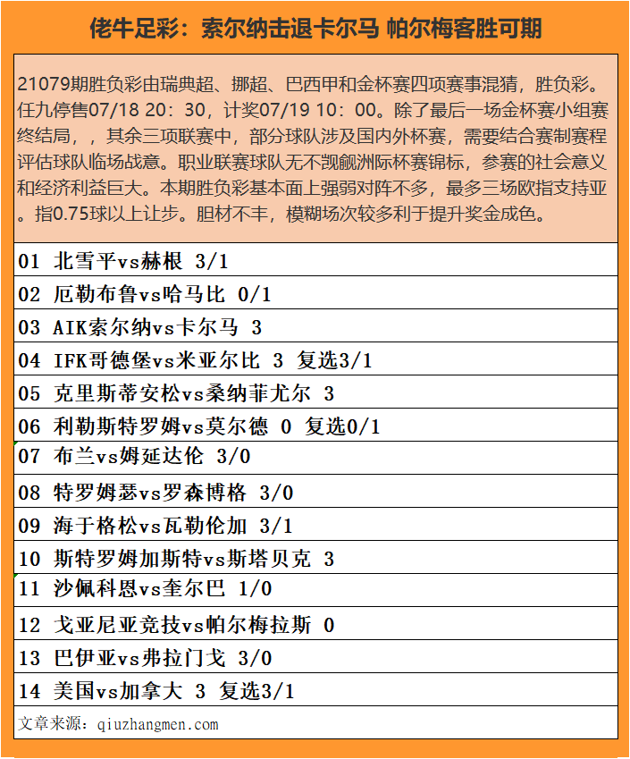 21079期胜负彩由瑞典超、挪超、巴西甲和金杯赛四项赛事混猜,胜负彩。任九停售07/18 20:30,计奖07/19 10:00。除了最后一场金杯赛小组赛终结局,,其余三项联赛中,部分球队涉及国内外杯赛,需要结合赛制赛程评估球队临场战意。职业联赛球队无不觊觎洲际杯赛锦标,参赛的社会意义和经济利益巨大。本期胜负彩基本面上强弱对阵不多,最多三场欧指支持亚。指0.75球以上让步。胆材不丰,模糊场次较多利于提升奖金成色。