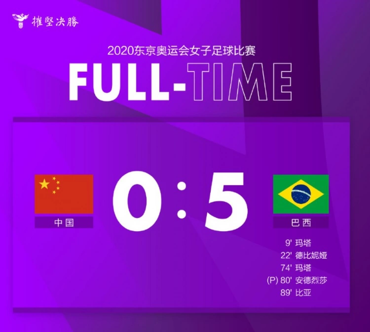 球掌门7月21日获悉:北京时间7月21日16:00,东京奥运会女足F组第1轮,中国女足对阵巴西女足。上半场,玛塔补射助巴西取得领先,随后德比尼亚再下一城,缪斯雯半场结束前远射造险;下半场,中国女足攻势渐起,王珊珊、张馨、王霜以及乌日古木拉相继中框,玛塔第73分钟梅开二度,安德雷萨点球得手,比娅特里斯打入第5球。最终,中国女足0-5不敌巴西女足,中国女足第2场比赛将于本周六对阵赞比亚。