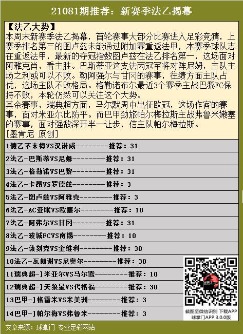 本周末新赛季法乙揭幕,首轮赛事大部分比赛进入足彩竞猜,上赛季排名第三的图卢兹未能通过附加赛重返法甲,本赛季球队志在重返法甲,最新的夺冠指数图卢兹在法乙排名第一,这场面对阿雅克肖,看主胜。巴斯蒂亚这支法丙冠军将对阵尼姆,主队主场之利或可以不败。勒阿强尔与甘冈的赛事,往绩方面主队占优,这场主队不败格局。格勒诺布尔最近3个赛季主战巴黎FC保持不败,本轮仍然可以关注这个大势。