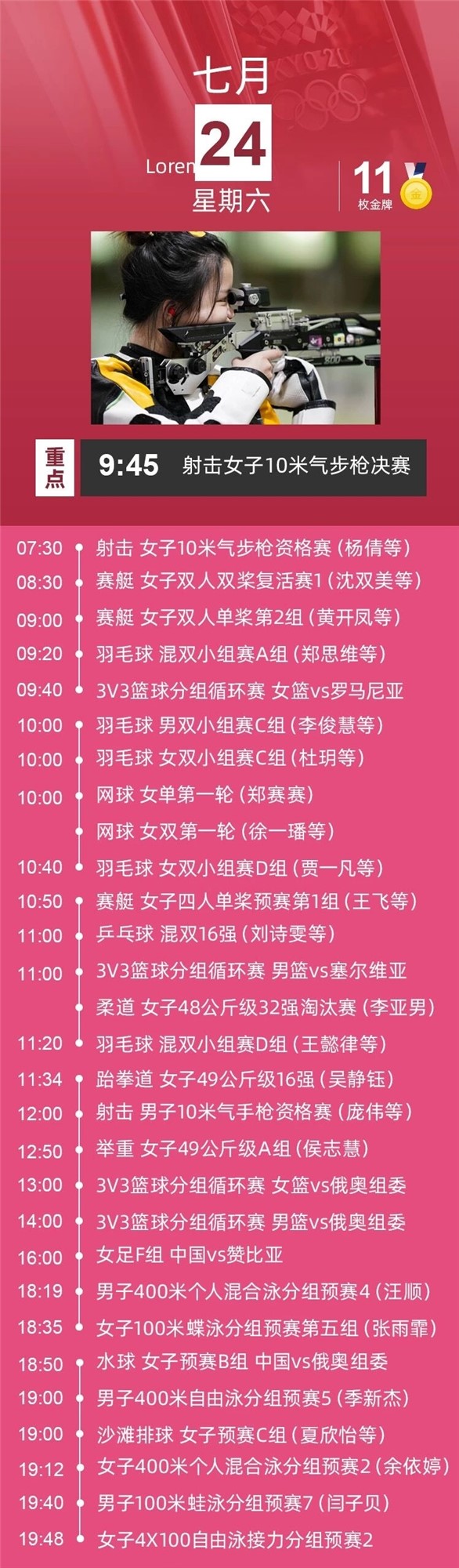 除了女子10米气步枪,另外10个将产生金牌的项目分别是男子10米气手枪、公路自行车男子公路赛、女子个人重剑、男子个人佩剑、女子49公斤举重、女子48公斤柔道、男子60公斤柔道、射箭混合团体、男子58公斤级跆拳道、女子49公斤级跆拳道,中国军团有望在女子10米气步枪(杨倩、王璐瑶)、女子49公斤举重(侯志慧)和女子49公斤跆拳道(吴静钰)中冲击金牌。