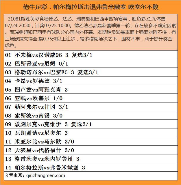 上期胜负彩临场推荐14中13,任九11转9中10注。21081期胜负彩竞猜德乙、法乙、瑞典超和巴西甲四项赛事,胜负彩.任九停售07/24 20:30,计奖07/25 10:00。德乙法乙都是新赛季第一轮,存在较多不确定因素。而瑞典超和巴西甲有球队分心国内外杯赛。本期胜负彩基本面上强弱对阵不多,有三场欧指支持亚.指0.75球以上让步,较多模糊场次之下,胆材不丰,利于提升奖金成色。