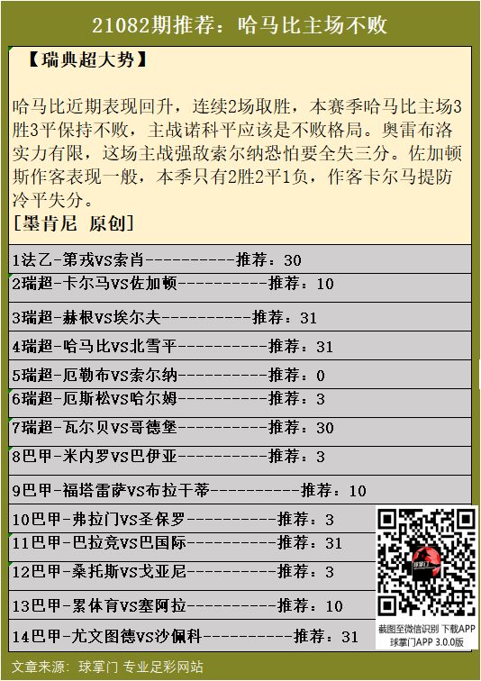 哈马比近期表现回升,连续2场取胜,本赛季哈马比主场3胜3平保持不败,主战诺科平应该是不败格局。奥雷布洛实力有限,这场主战强敌索尔纳恐怕要全失三分。佐加顿斯作客表现一般,本季只有2胜2平1负,作客卡尔马提防冷平失分。