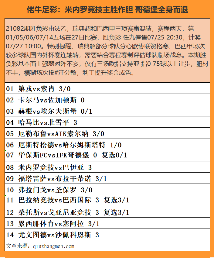 21082期胜负彩由法乙,瑞典超和巴西甲三项赛事混猜,赛程两天,第01/05/06/07/14五场在27日比赛,胜负彩 任九停售07/25 20:30,计奖07/27 10:00。特别提醒,瑞典超部分球队分心欧协联资格赛,巴西甲场次较多球队国内外杯赛连轴转,需要结合赛程赛制评估球队临场战意。本期胜负彩基本面上强弱对阵不多,仅有三场欧指支持亚 指0 75球以上让步,胆材不丰,模糊场次投#注分散,利于提升奖金成色。