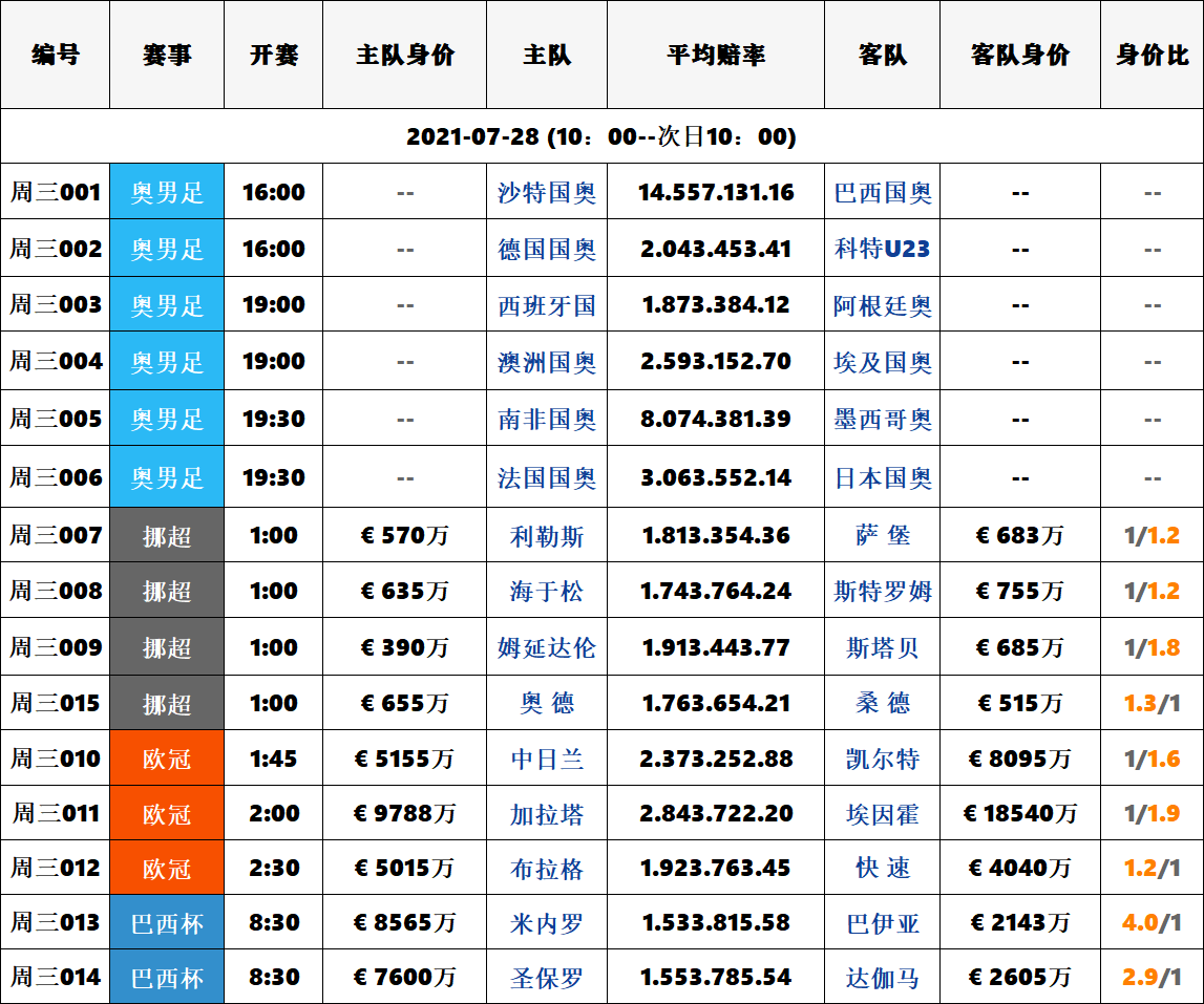 7月28日足球赛事|周三足球球队对阵身价数据表