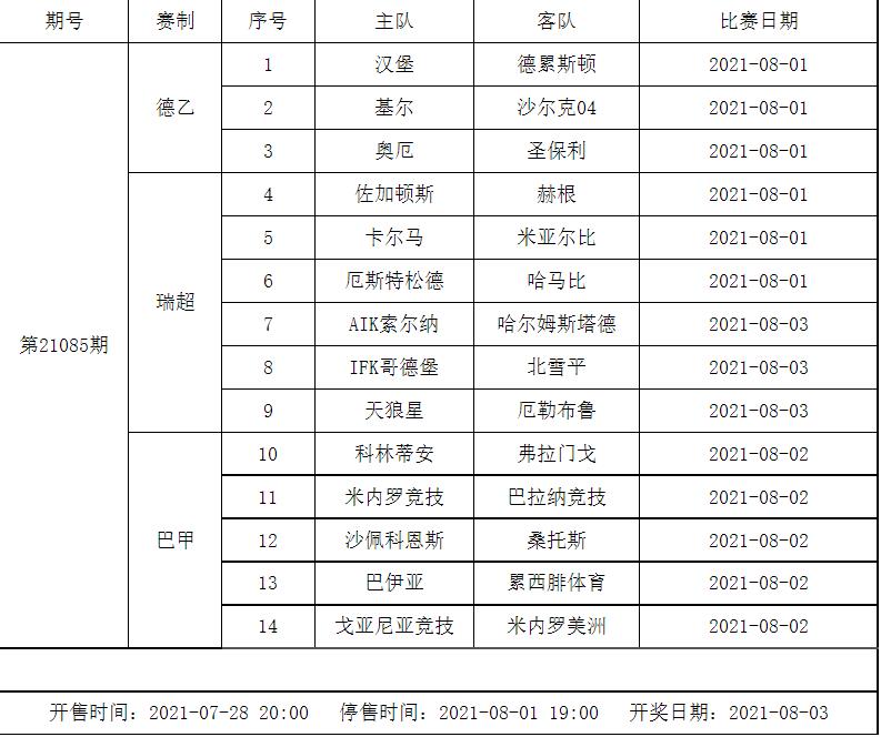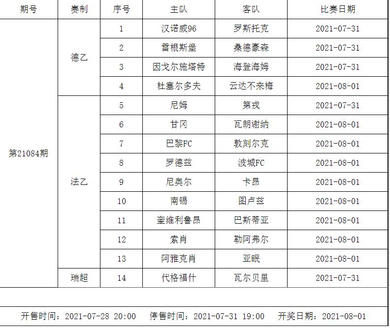 我中心制定了2021年中国足球彩票胜负游戏(14场、任选9场)、6场半全场胜负游戏和4场进球游戏7月30日-8月5日的竞猜场次安排(具体附后),其竞猜对象、开售时间、停售时间和计奖时间均以本文为准。