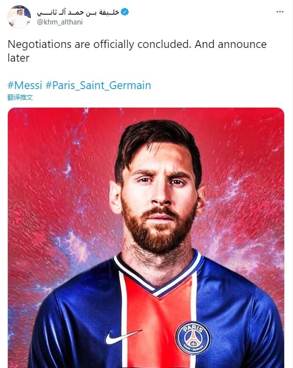 球掌门8月7日获悉:卡塔尔王室成员、巴黎幕后卡塔尔财团中的Khalifa Bin Hamad Al-Thani在个人推特上发文透露梅西加盟巴黎进展。他表示:“双方正式达成协议,将在之后官宣。”