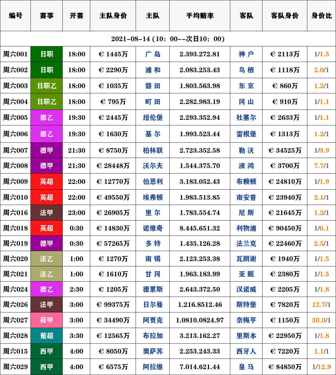 足球14日赛事|周六球队对阵身价数据信息汇总表