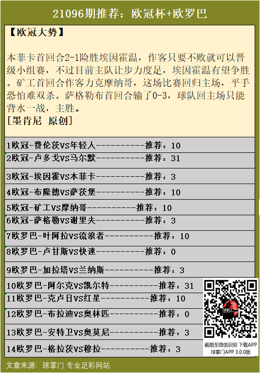 本菲卡首回合2-1险胜埃因霍温,作客只要不败就可以晋级小组赛,不过目前主队让步力度足,埃因霍温有望争胜。矿工首回合作客力克摩纳哥,这场比赛回归主场,平手恐怕难双杀。萨格勒布首回合输了0-3,球队回主场只能背水一战,主胜。
