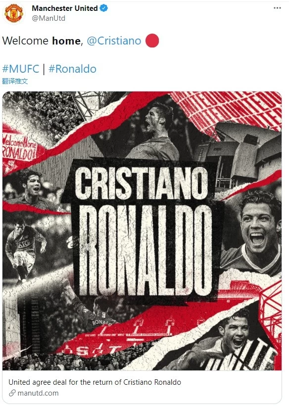 我们很高兴地宣布,俱乐部已经和尤文图斯就克里斯蒂亚诺·罗纳尔多的转会达成一致。他将与我们签约至2023年6月。