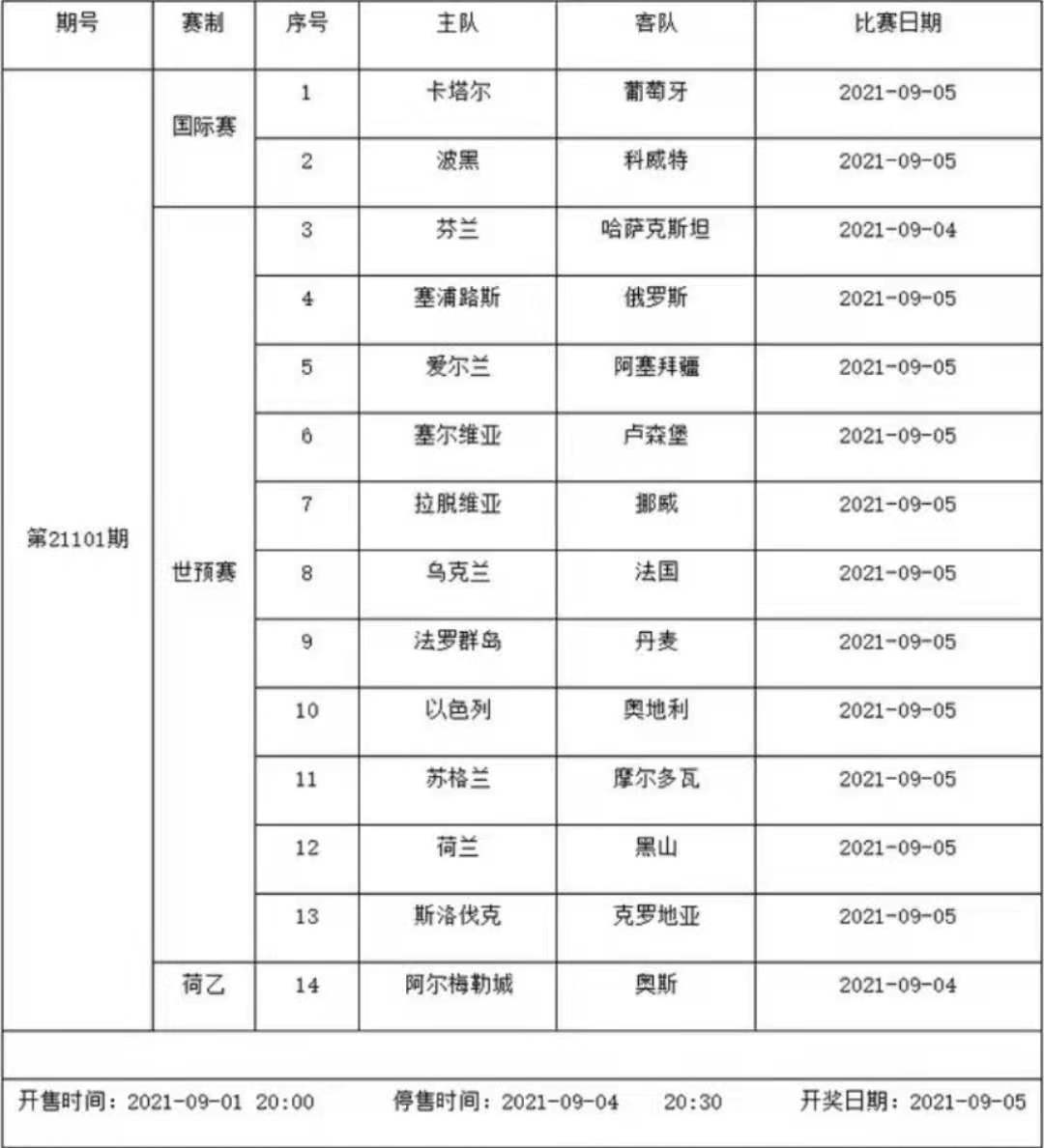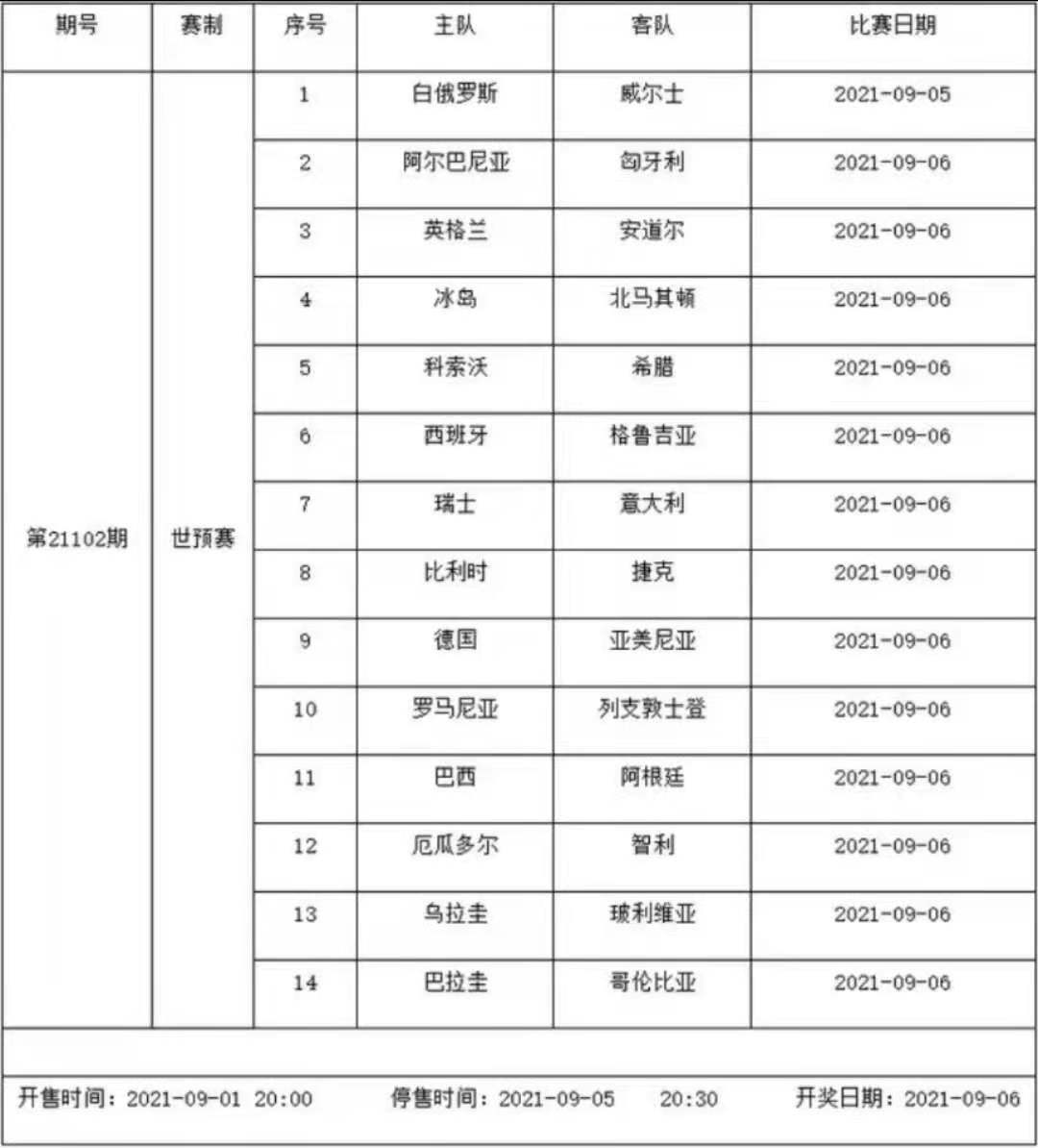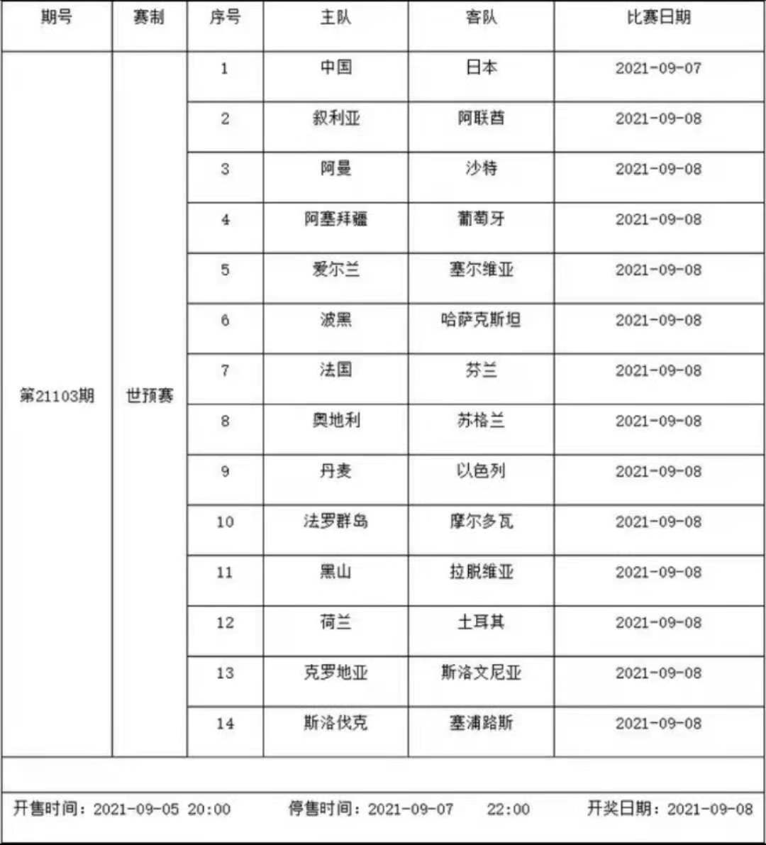 我中心制定了2021年中国足球彩票胜负游戏(14场、任选9场)、6场半全场胜负游戏和4场进球游戏9月3日-9月9日的竞猜场次安排(具体附后),其竞猜对象、开售时间、停售时间和计奖时间均以本文为准。