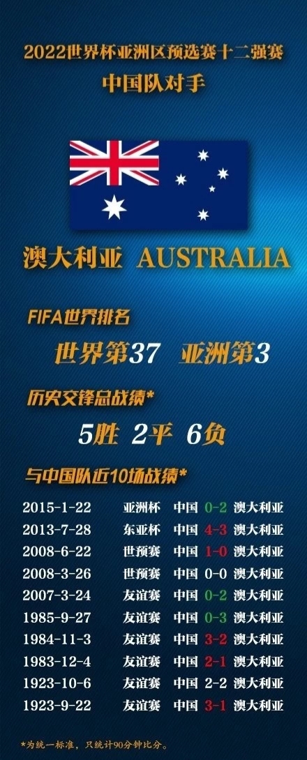 而上一次中澳在世预赛相遇则是在2008年,国足首回合主场0-0战平澳大利亚,次回合客场1-0小胜。