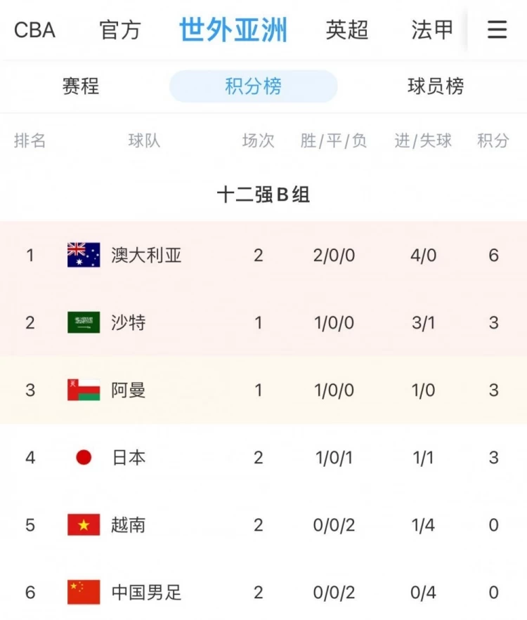 国足前两轮一球未进丢4球,因净胜球劣势排名倒数第一,越南倒数第二。早先进行的澳大利亚1-0战胜越南,两连胜暂时排名小组第一,阿曼与沙特的比赛仍在进行中。