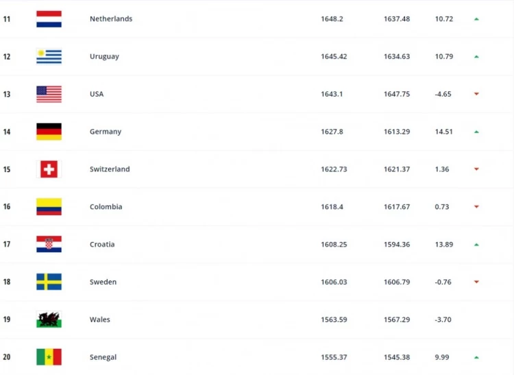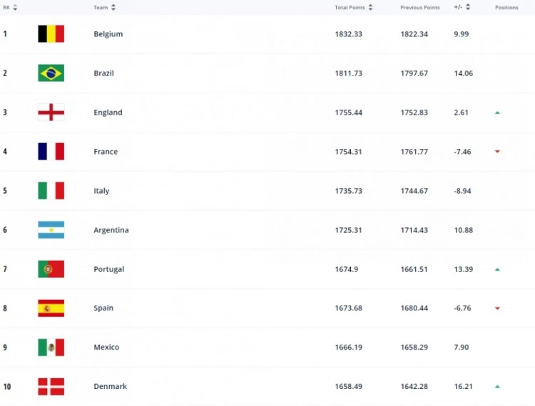 世界排名方面,比利时继续维持头名宝座,丹麦上升一位进入前10,美国则从前10跌出至第13位。