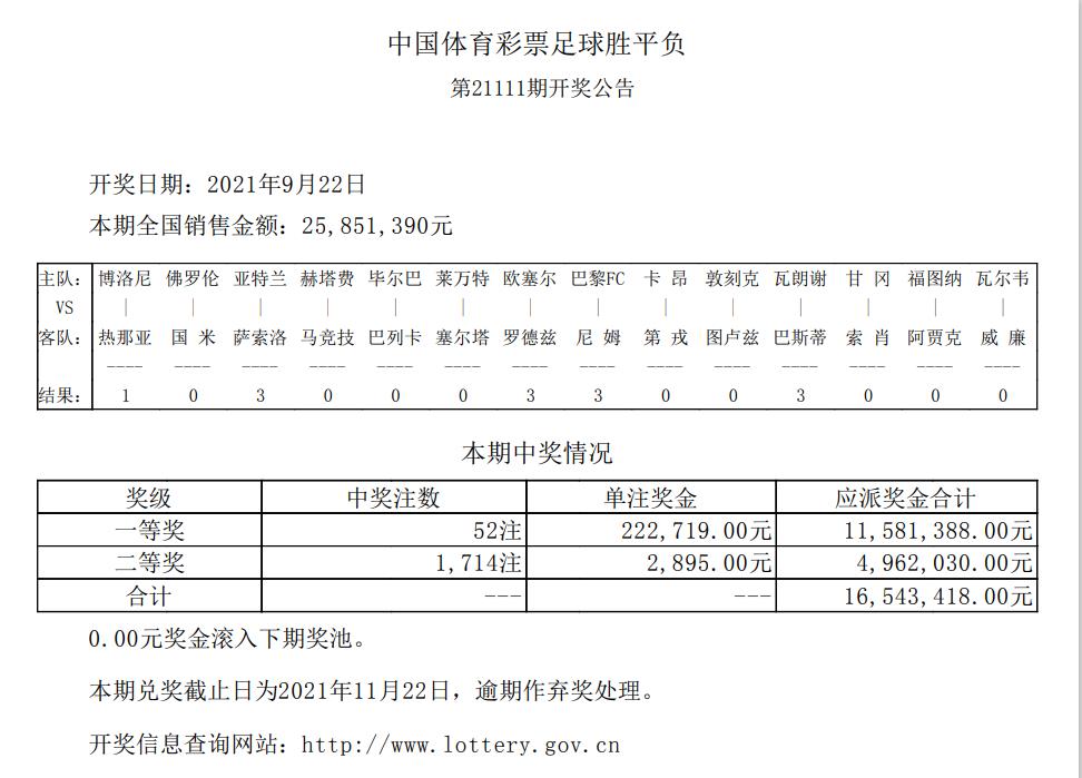 首页/ 赛事正文北京时间9月22日,胜负彩第21111期开奖结果揭晓。本期一等奖开出52注,单注奖金22.2万余元,二等奖开1714注,单注奖金2895元;任九头奖8131注1799元。本期胜负彩销量为25,851,390元,任九投注总额为22,863,800元。