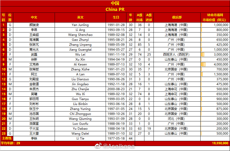 前锋:7-武磊、9-艾克森、11-阿兰、16-郭田雨、17-刘彬彬、18-张玉宁、21-洛国富