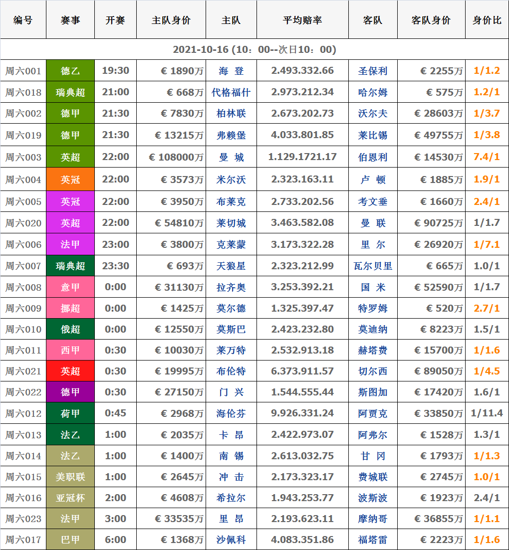 10月16日|球队对阵身价信息数据表