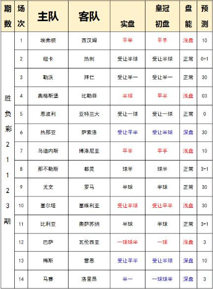 11、比利亚雷尔上轮完胜贝蒂斯,联赛至今不败,不过多达5场平局,埃梅里的球队防守比较稳健,但是进攻略显疲软,球队下周中欧冠客场面对年轻人,前2轮未胜,埃梅里或许会有一定的留力,但比利亚的硬实力有限,球队想出线并不易,此役主力前锋迪亚伤缺;奥萨苏纳上轮小胜巴列卡诺,联赛斩获2连胜,奥萨苏纳这个赛季表现不俗,开局只有2败,球队有一定的得分能力,但是防守不够稳健,此役主力后卫阿里达内,主力前锋布迪米尔伤缺,本场初指正常,半球盘,后市则是升至半一低水盘,有继续升盘的趋势,这个盘很有意思,如果升至一球盘,以比利亚的羸弱得分能力而言也是自带阻力,但是有一点也不能忽视,就是奥萨苏纳是客场龙,开赛至今,3个客场全胜,这种背景下,比利亚升盘也不排除拉升上盘信心的意图,毕竟比利亚的硬实力摆在那里,这场比利亚雷尔最多一球小胜吧,平局有条件还是要防一下