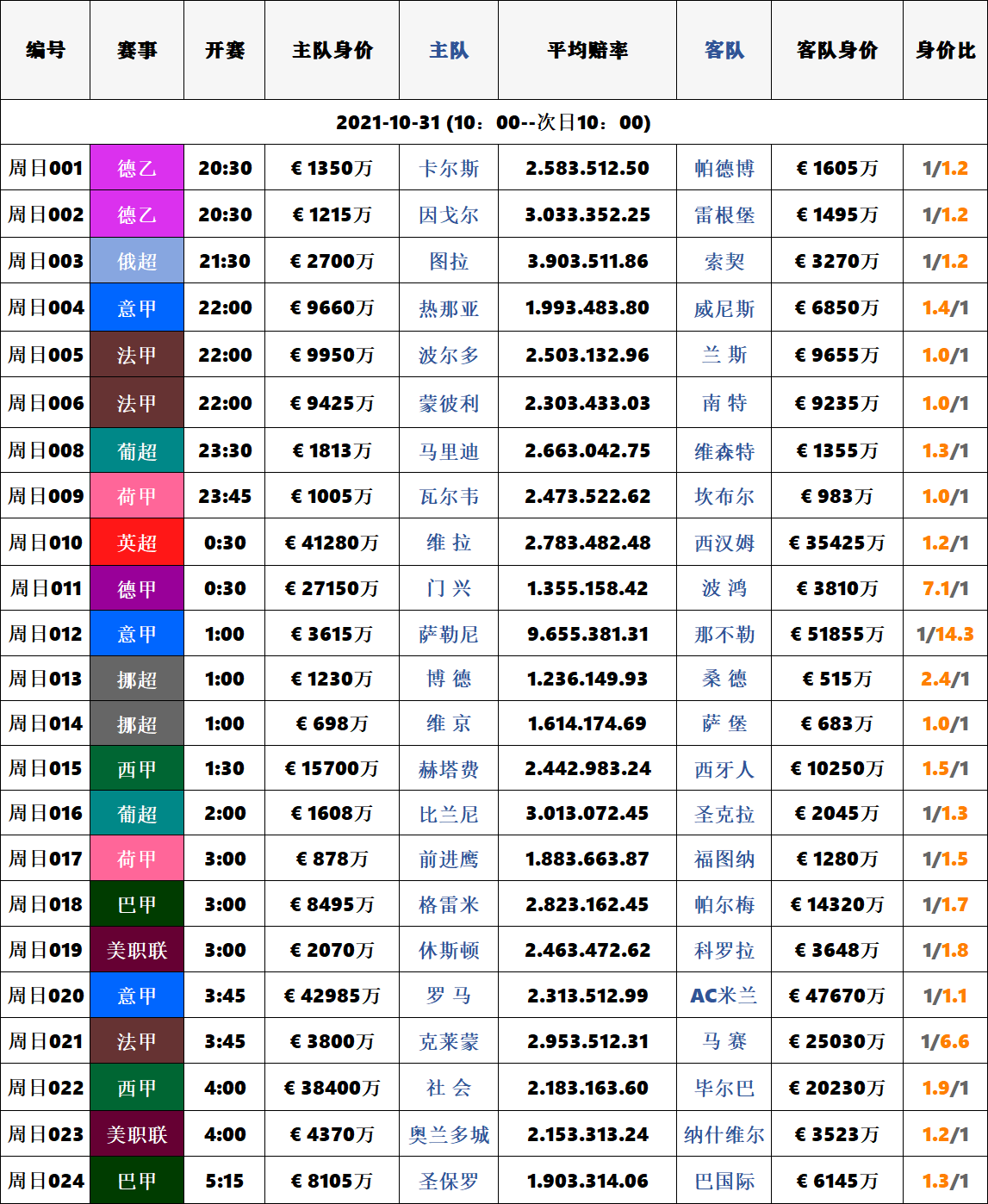 31日赛事|周日足球球队对阵身价数据信息汇总