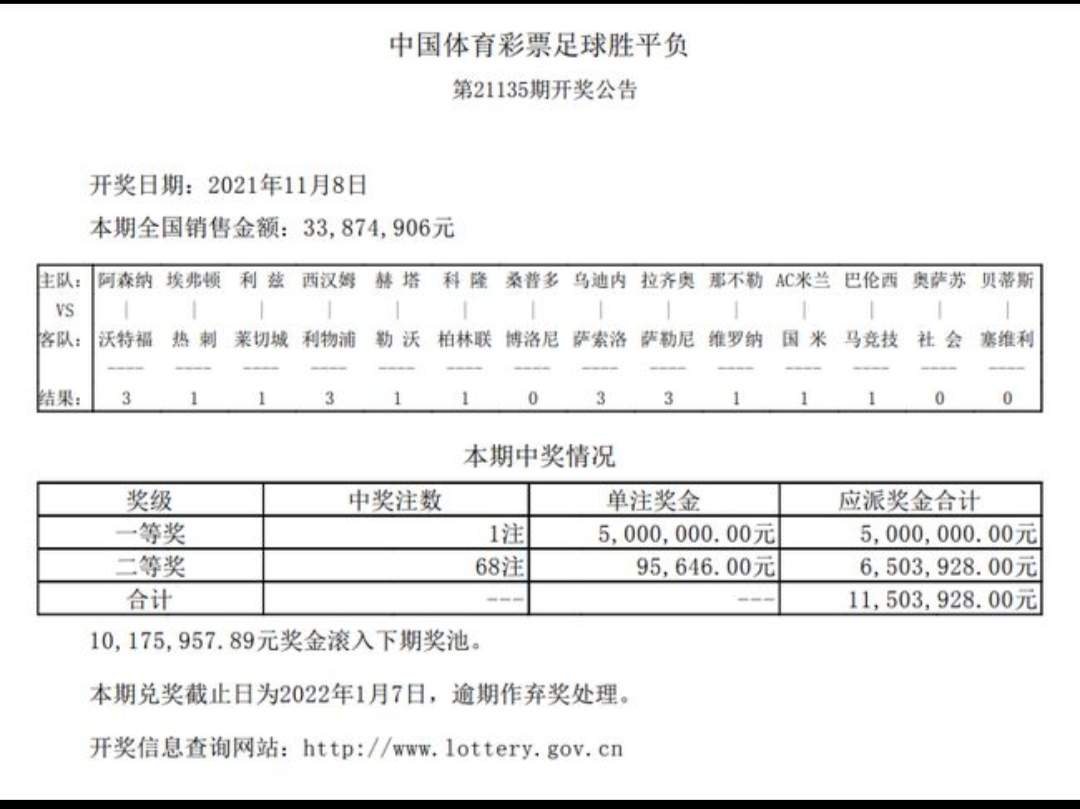 首页/ 赛事正文北京时间11月8日,足彩第21135期开奖结果揭晓。本期足彩14场头奖开1注,单注奖金500万元;滚存1017万,二等开出68注95,646元;任九开出1051注15,160元。本期足彩14场投注总额为33,874,906元,任九投注总额为24,896,672元。