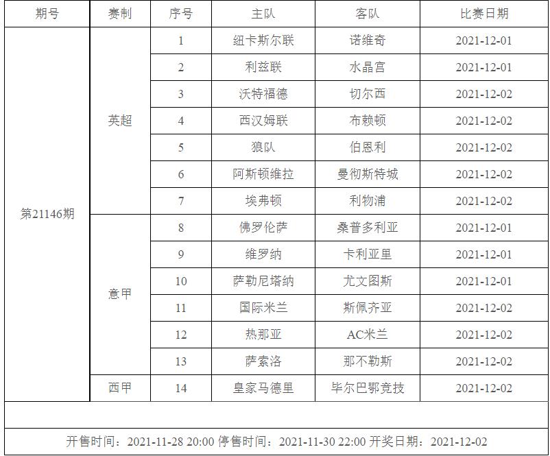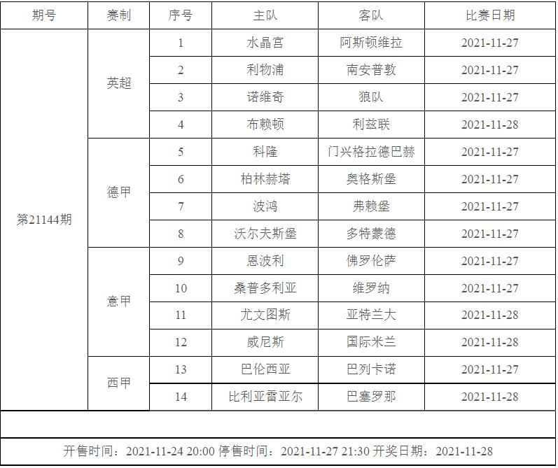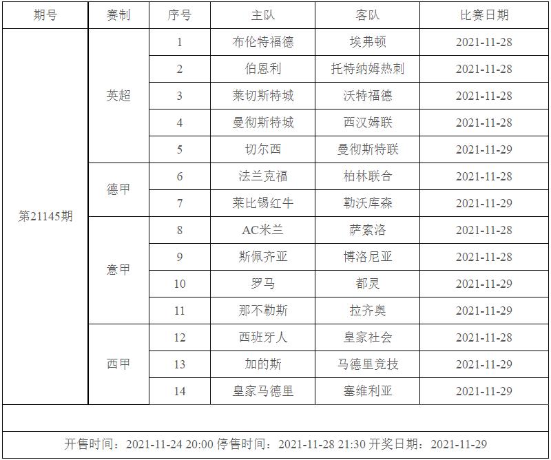我中心制定了2021年中国足球彩票胜负游戏(14场、任选9场)、6场半全场胜负游戏和4场进球游戏11月26日-12月2日的竞猜场次安排(具体附后),其竞猜对象、开售时间、停售时间和计奖时间均以本文为准。