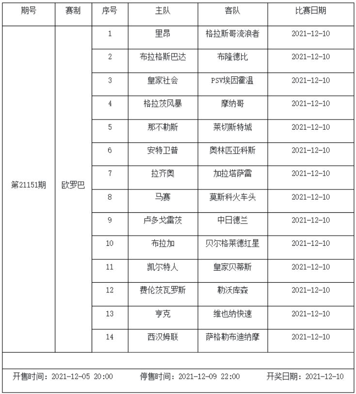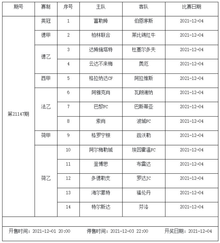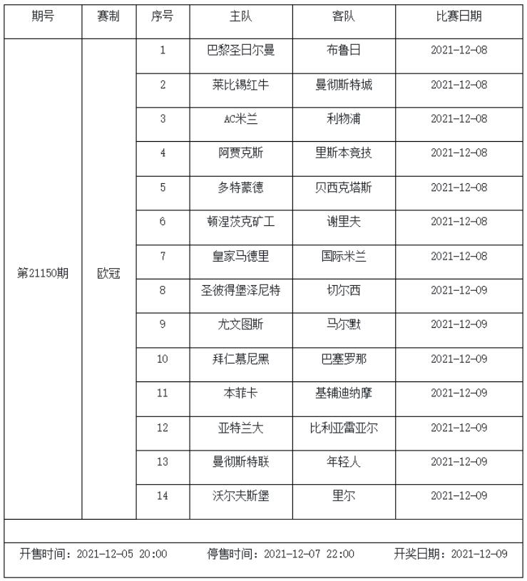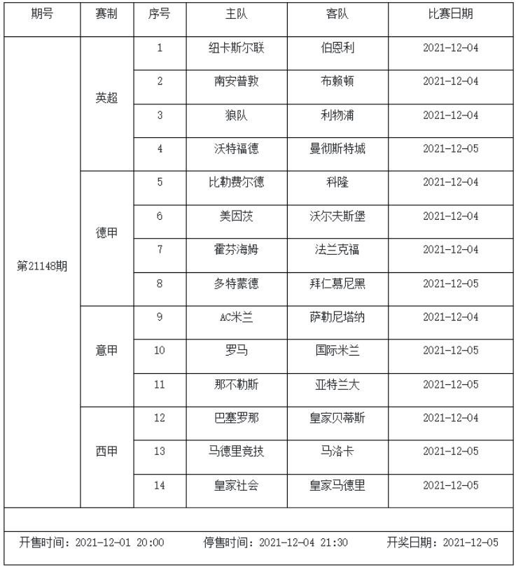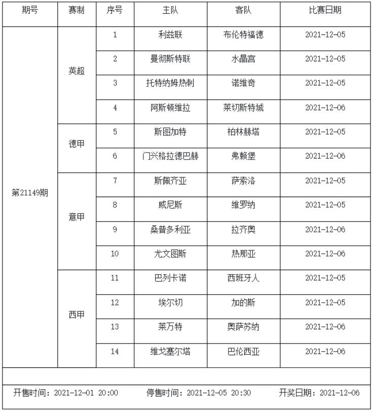 我中心制定了2021年中国足球彩票胜负游戏(14场、任选9场)、6场半全场胜负游戏和4场进球游戏12月3日-12月9日的竞猜场次安排(具体附后),其竞猜对象、开售时间、停售时间和计奖时间均以本文为准。